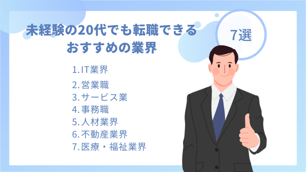 未経験の20代におすすめの転職先として7つの業種を紹介します。